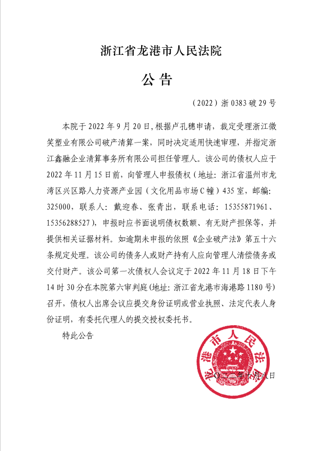 浙江微笑塑業有限公司破產清算案公告