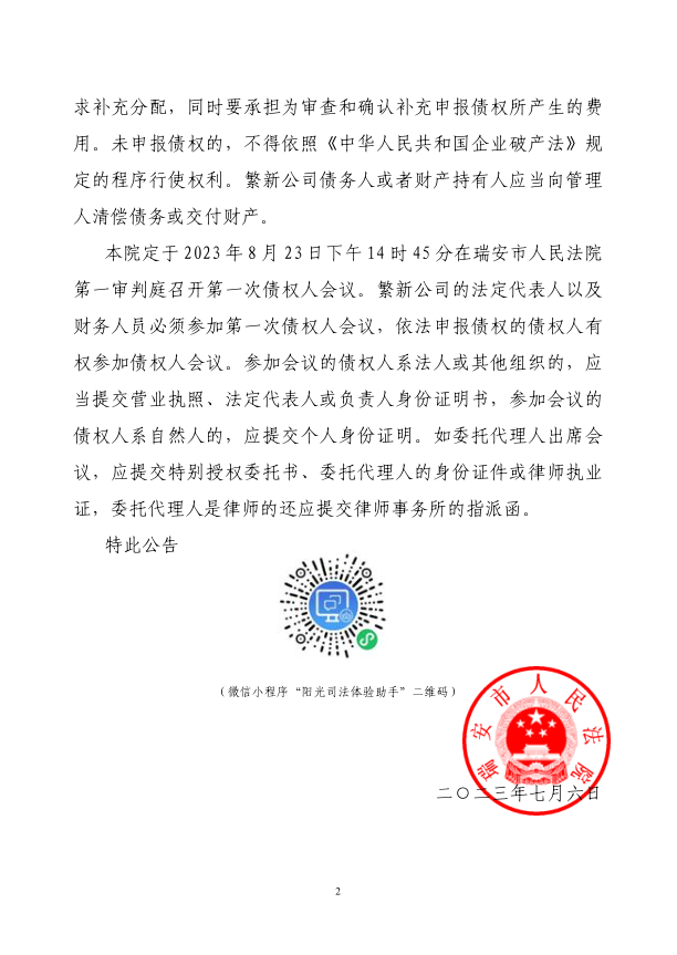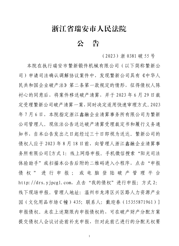 瑞安市繁新鍛件機械有限公司破產清算案公告