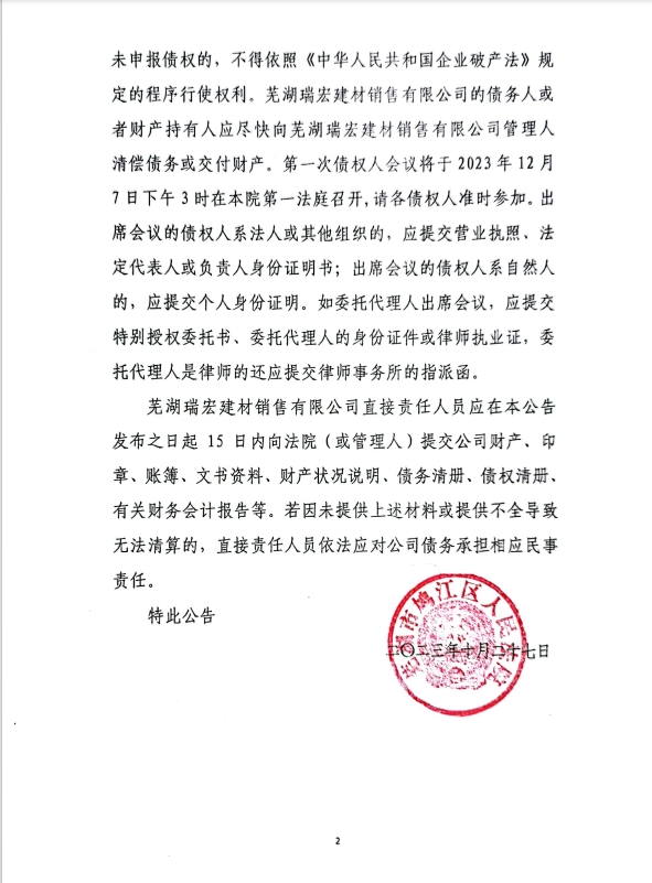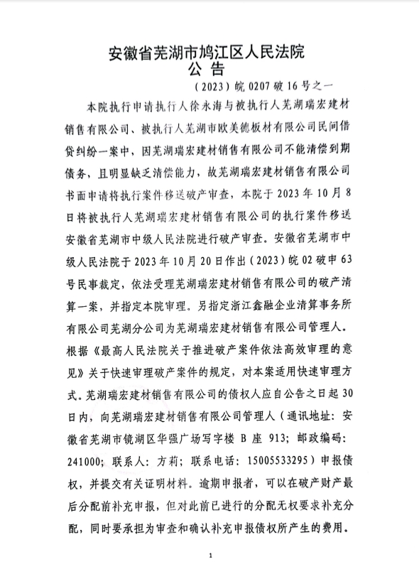 蕪湖瑞宏建材銷售有限公司破產清算案公告