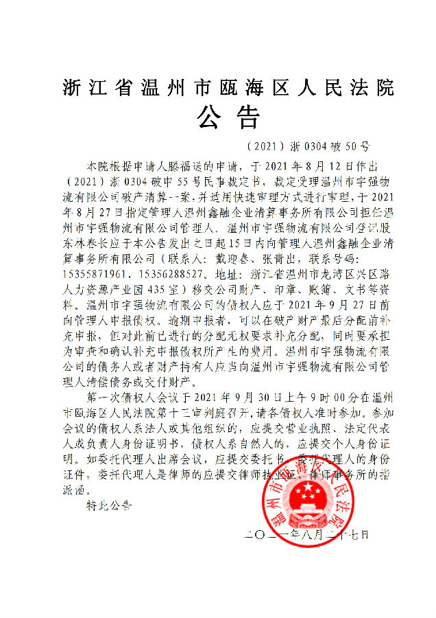 溫州宇強物流有限公司破產清算案公告