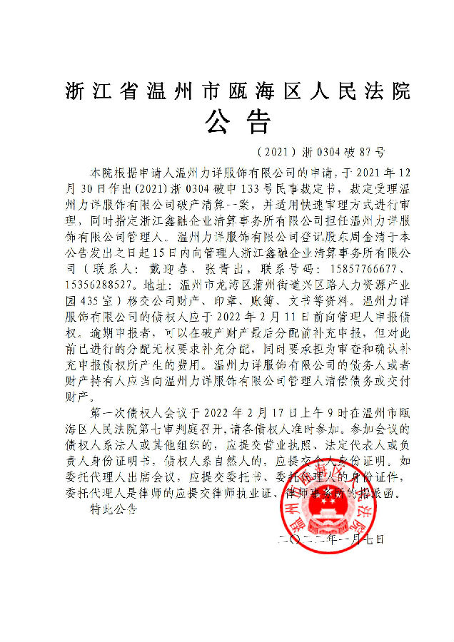 溫州力詳服飾有限公司破產(chǎn)清算案公告